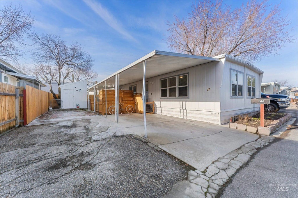 MOTIVATED SELLER! This charming and updated home is light and bright with lots of natural light from all the windows. This 2-bedroom, 2-bathroom floor plan provides ample comfortable living space with LVP flooring and tile throughout. The generous living room flows into the dining room and the newly designed galley kitchen features a newer gas range, microwave, sink, backsplash, concrete countertop and cabinetry. Other newer home updates include, TPO roof (2023), interior and exterior paint and furnace. The property includes an 8x12 shed complete with electrical wiring, shelving, windows and added outdoor outlets. New cedar wood full perimeter fencing with multiple access gates installed in 2023. There are parking spaces for 3 cars: 1 covered space & 2 uncovered. Great central location on the Boise Bench close to shopping, airport and downtown. Low maintenance lot. Move in ready! Offers will be subject to approval of the park. Space rent is $755/mo. includes, water, sewer & trash. Power is around $40/mo. & gas is around $17/mo