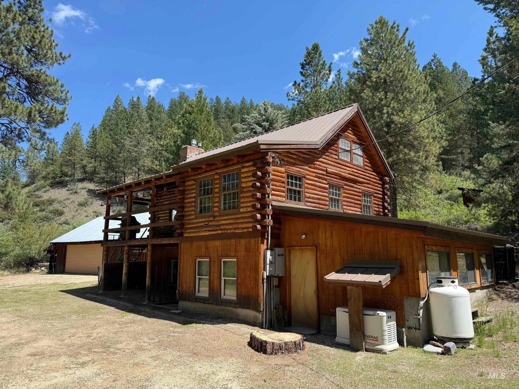 The famous "HYDE OUT" is now available overlooking More's Creek and backing to public land! This once in a lifetime property offers 2172 sq ft of log cabin living area across 3 stories and a huge covered patio to enjoy the sound of the creek! Year around access direct from your private drive off HWY 21. Property is ready for all your toys and equipment with a detached Shop 12x25 w/220V power, Barn or RV garage 32x28 with power, Car Port 13x25 and 2 car garage 24x25 and generator back up! See the ELK, deer and turkeys almost daily yet only 45 minutes to the Boise Airport! Home comes with a bedroom and bath on each level, refrigerator and 4 Season living! Call ahead for an Appointment to see ALL this unique property has to offer. Watch the DRONE tour attached to the listing and thanks for looking!