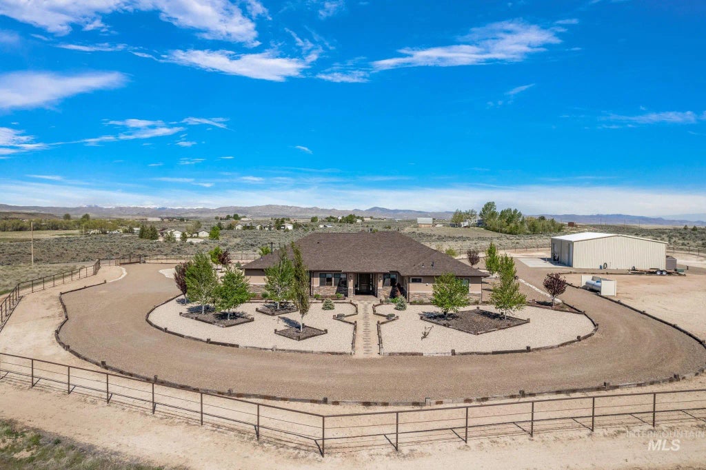 Privately located at the end of a quiet road on over 10 acres with stunning mountain views, this one-owner custom estate offers the ideal blend of comfort, functionality, and Idaho freedom. The single-level home features 10' ceilings, granite and ceramic tile throughout, a true chef’s kitchen with dual islands, high-end appliances, and a large walk-in pantry. The split-bedroom layout includes 3 beds, 2.5 baths, a spacious office/den, and a primary suite with walk-in shower and closet. Entertain with ease on the expansive covered patio, low-maintenance landscaping, and thoughtfully designed indoor-outdoor flow. The attached garage connects to a massive insulated shop with multiple roll-up doors, full bath with shower, RV storage, and space for all your toys, projects, or extended living needs. Dual A/C units, dual water heaters, 400-ft well, and 1,000-gallon propane tank. Zoned RR—horses, chickens, and cows welcome. No HOA dues & truly move in ready! Minutes from the growing Mayfield corridor!