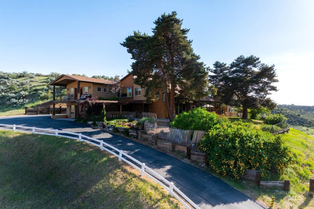 Extremely rare equestrian property in the Boise Foothills, just minutes from downtown. 9.05 acres of lush pasture, surrounded by wildlife, with spectacular valley views from most all rooms and especially the hot tub. Unique year round (spring fed) ponds provide pressurized irrigation for the large pasture. 16'x36' shop, riding arena, segregated corrals, barn, tack room, deer-proof garden, chicken coop, and a dog run compliment the site. This 2929sf home was extensively updated/reimagined in 2018-2020 with fully remodeled kitchen, hickory engineered wood flooring, bathrooms, master suite, master bathroom, wood fireplace insert and stucco siding. It features huge windows to maximize natural light and showcase the panoramic view. Endless equestrian foothill trails are available right from the property as it is adjacent to public land, located just 1/2 mile west of the popular Pole Cat trailhead. Looking for multi generational family development potential? Here it is!