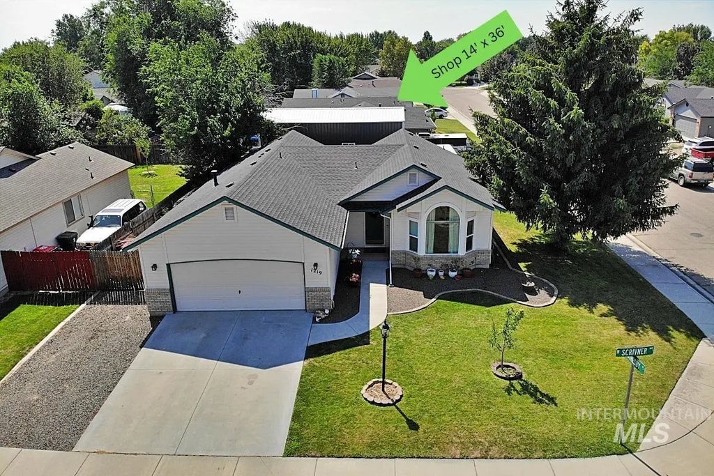 PRICE REDUCED! Tucked in the heart of Meridian yet wrapped in peaceful, country charm, this home offers the best of both worlds. Inside, an open-concept layout and vaulted ceilings create a bright, welcoming feel. Major updates include a new roof (2021), furnace and A/C (2020), and Pella double pane windows (2023). The oversized 14x36 shop is a dream — complete with 50amp and 220 available, a loft, 8x10 and 6x8 garage doors both with wall-mount openers, and a man door. A 14x10 rolled gate provides shop access, and a 10' gate at the front adds extra parking potential. Out back, a 45x12 covered deck with built-in seating and roll-down shades sets the stage for grilling with friends and family, catching up in the shade, or just taking in the cherry and apple trees, berry patches, garden beds, and a sweet little chicken coop. A smart sprinkling system with drip lines makes gardening a breeze. With an assumable VA loan at an incredible 2.75%, this home is a rare blend of charm, function, and value.