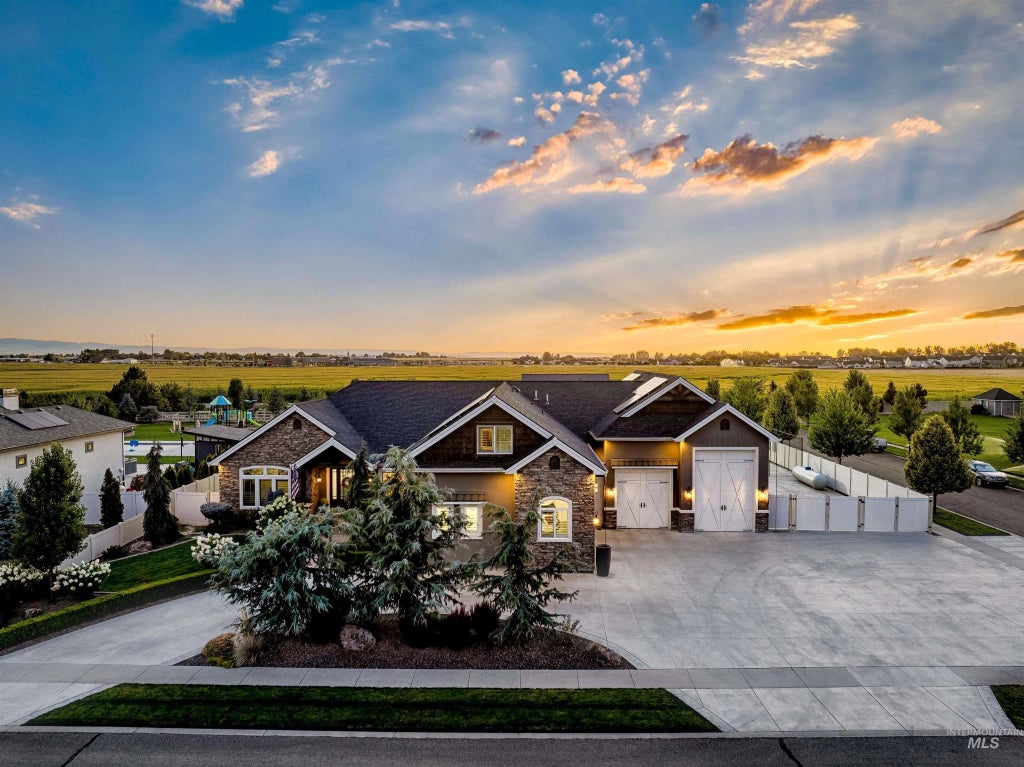 Welcome to a serene family oasis in Meridian! Situated on a sprawling 1-acre lot, this exceptional home offers 6 bedrooms and 5 bathrooms spread across over 6,500 square feet of living space. The main level is ideal for family gatherings, featuring a master suite for restful retreats, a large great room for hosting guests, and a spacious kitchen designed for memorable family dinners and celebrations. The kitchen is a delight to cook in with professional grade appliances and a large walk-in pantry. Additional amenities include a generous recreation room, a home theater for movie nights, separate living quarters for extended family or guests, and solar panels with a backup generator. The expansive backyard is a haven of activity and joy, featuring a pool, pickleball court, basketball court, a large garden, and a playground. For those with a spirit of adventure, a massive 52’ RV garage and a detached shop offer plenty of space for storing recreational vehicles.