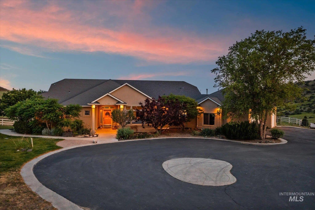 Experience elevated living in the Boise Foothills on this ~11-acre estate with panoramic views and direct access to the Ridge to Rivers trail system. Just 10 miles from downtown Boise or Eagle, this unique property offers a blend of natural beauty and urban convenience. The extensively remodeled home features 5 bedrooms, multiple flex spaces, a chef’s kitchen with Thermador appliances, radiant heated floors, custom library, office with serene views, and a luxurious primary suite. The great room opens to a south-facing deck with stunning vistas. Prepped for equestrian use, the grounds include a round pen, permitted shelters, tack/stall area, and solar-powered privacy gate. Ample storage for cars, toys and equipment with an attached 3-car garage plus a detached 3-bay garage with loft and half bath. Bonus: a new, heated chicken coop and run—complete with a guest swing. A rare foothills retreat offering space, style, and endless recreation.