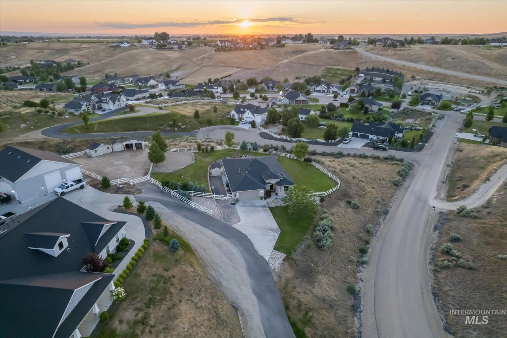 Views, Views, Views! 2 acres with an extra buildable parcel included! Visit this excellent single-level home perched along the top of the local Star foothills. This well-maintained property offers peaceful, private panoramic views highlighted by its amazing sunsets. Tucked away in the private back corner of a small community, come step inside to a bright and open floor plan filled with natural light and a kitchen that features quartz countertops, a large island, a walk-in pantry, and luxury Bosch appliances. The master suite includes a freestanding soaker tub, walk-in shower, dual vanities with quartz counters, tile flooring, and convenient laundry room access. Two parcels are included; use the second lot for more outbuildings, shops, or a second home. Outside, unwind in the beautifully landscaped backyard with a beautiful paver patio complete with a covered gazebo—perfect for soaking in those Idaho sunsets. Primary enclosed fencing and 4 sheds/outbuildings, 20x10 10x18,10x8,8x12; bring those animals and toys! Must see! Willing to work with a contingency.
