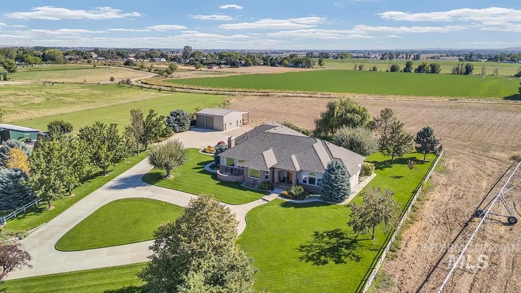 Prime location, single-level 10-acre estate at the end of tree-lined private lane with easy freeway access in Meridian! Pristine privacy & views + home business opportunity. Gourmet kitchen is the center of the home with prep sink, walk-in pantry, extensive cabinetry & expansive counter space, island seating + breakfast bar open to vaulted family room with exposed beams, brick-encased fireplace and custom built-ins, along with dedicated office perfect for work-from-home.The light-filled dining area seamlessly engages the kitchen and opens to the front courtyard, perfect for taking dinner outdoors to enjoy the views, while covered back patio allows for BBQ year-round with further spectacular, private scenery. Laundry room (sewing station, folding counter, freezer, ironing board, and utility sink) connects with mud room & oversized 3-car garage with add'l storage room. Central vac, dual HVAC, water softeners, private well, and septic system make this beauty beyond functional. Land is irrigated by Zimmatic pivot & 3-phase power to fuel farming & homestead opportunities. Add to that the mature landscaping, extensive paved drive and 30x30 shop w/ 17’ RV bay doors, inside loft & insulated office to run a business from. Add'l RV parking space, power/dump & pole barn off shop.